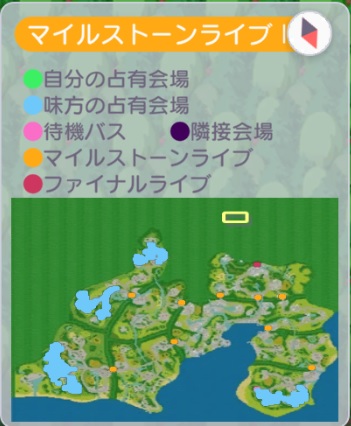 マップ内の各地でライブを成功させることで会場を占有し、エリアを開放していくことができます