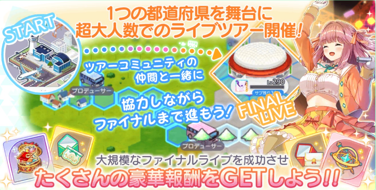 最大70名の「ツアーコミュニティ」で協力して広大なマップを攻略しマップ中央にあるファイナルライブの攻略を目指します
