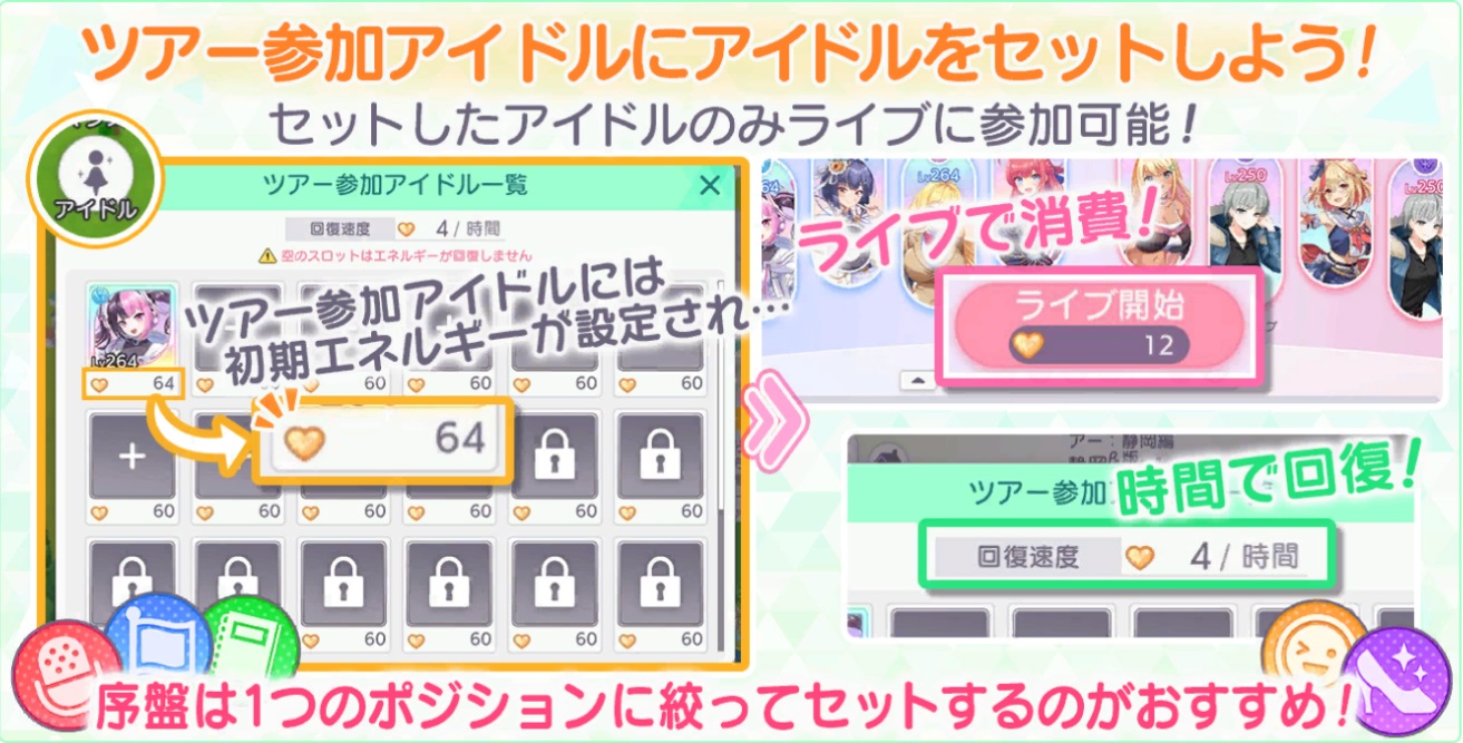 ・ただし、 一度セットしたアイドルを解除すると、 そのスロットのエネルギーが0になるのでご注意ください