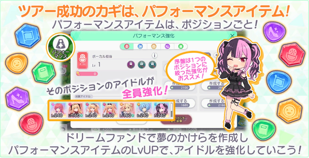 ・パフォーマンスアイテムによって、 アイドルをポジションごとに強化できるため、 序盤は1つのポジションに絞ってアイドルをセットするのがおすすめです