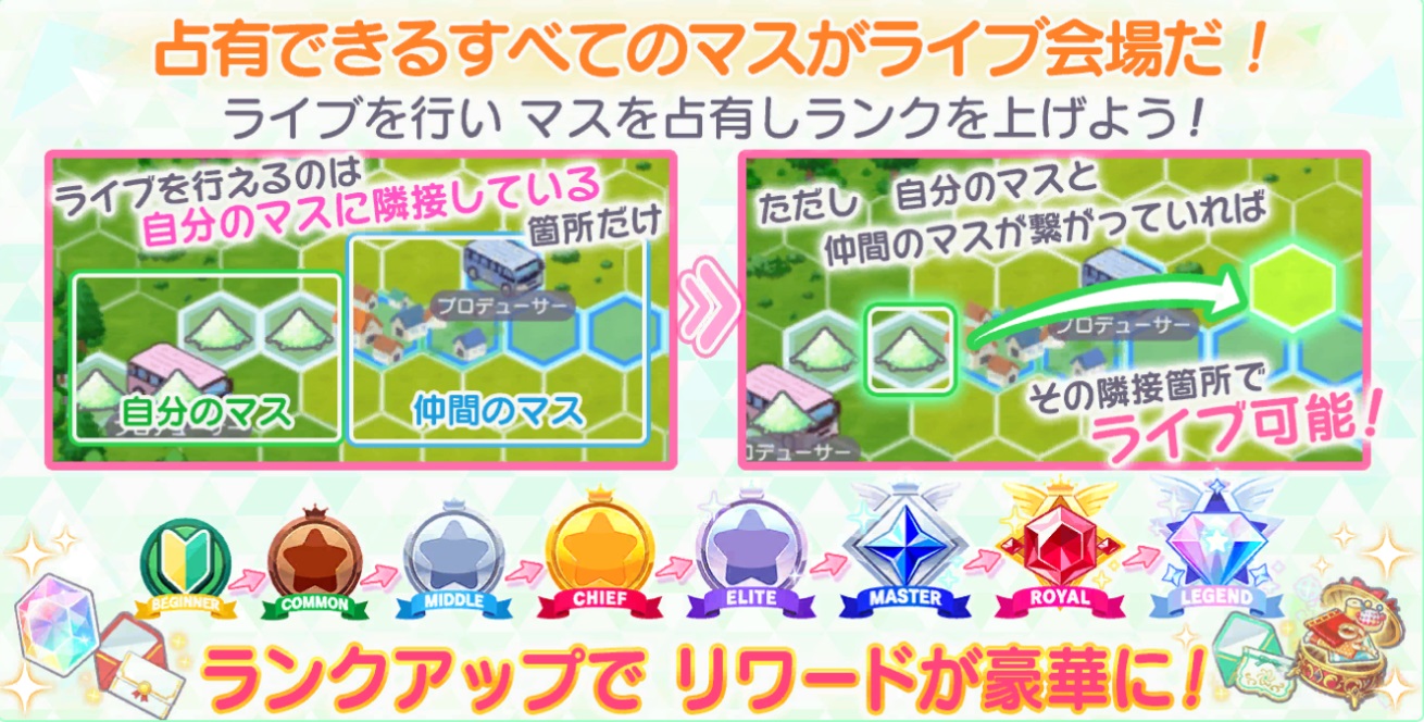 グループ内の事務所と協力して、マップ中央のファイナルライブまでエリアを繋げて成功させましょう。