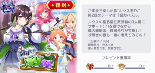 第2回のテーマは「協力パズル」ルクスの誇る個性派頭脳の3人組にサポート(?)を受けながら真の頭脳派・綾瀬るりが宝探し!開放条件:6-20クリア開催期間:~11/15 12:59
